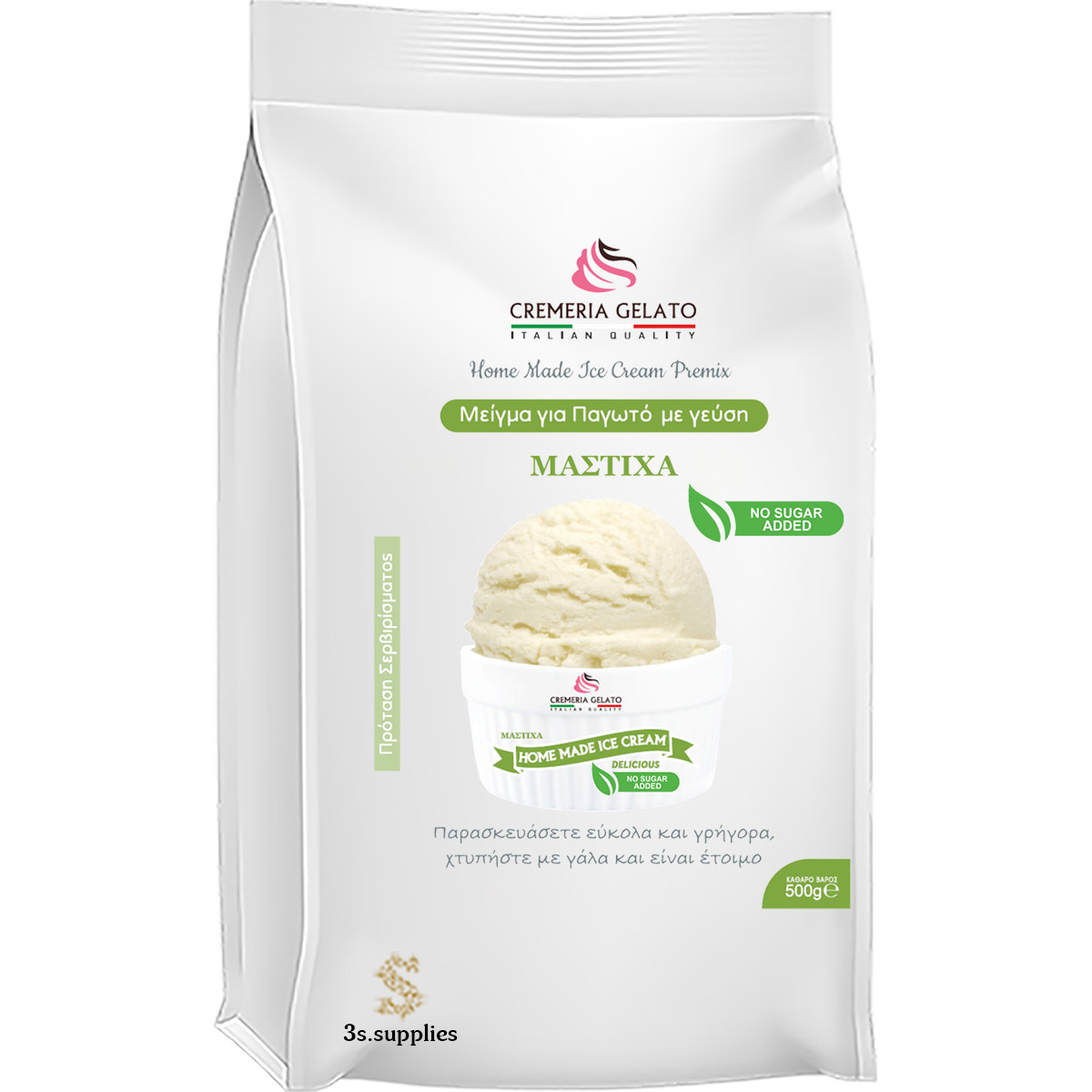 Premium μείγμα για την παρασκευή πλούσιου, σκληρού παγωτού με την αυθεντική, παραδοσιακή γεύση της μαστίχας Χίου, χωρίς την προσθήκη ζάχαρης. Εξασφαλίζει επαγγελματική υφή και μοναδικό άρωμα χρησιμοποιώντας απλά ένα οικιακό μίξερ ή παγωτομηχανή.